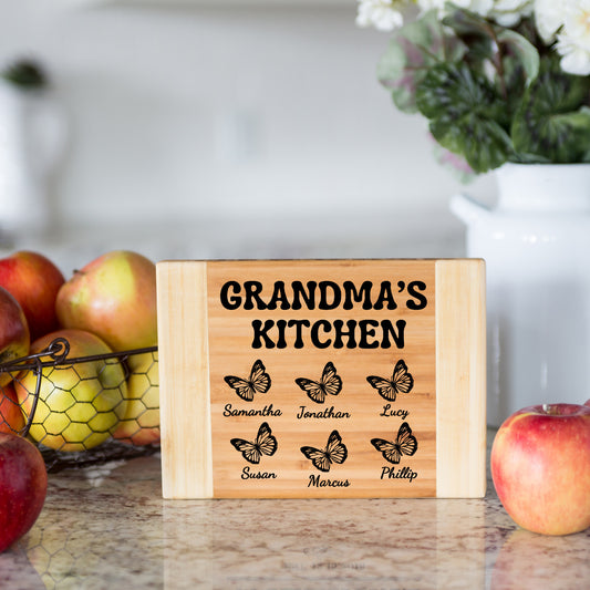 'Grandma's Kitchen' Cutting Board with Grandkids names and butterflies, Custom Bamboo Board, Personalized Family Gift